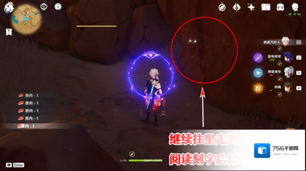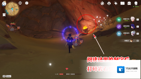 回到分岔路口,这次我们走左边的路。进去走到头以后可以看到这里也被岩石挡住了,并且旁边是有刻字可以阅读的。我们阅读之后打碎岩石,接着往里走。