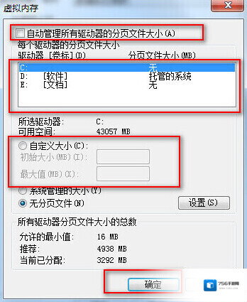 第四步:在弹出的窗口中取消勾选“自动管理所有驱动器的分页文件大小(A)”,然后选择要设置虚拟内存的盘符,勾选“自定义大小”,在设置了合适的虚拟内存大小后点击设置,最后点击确定完成设置操作。这里的具体磁盘以及大小,大家根据自己的需要来划分哦!