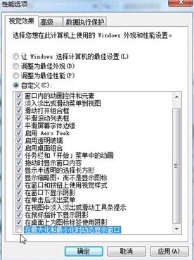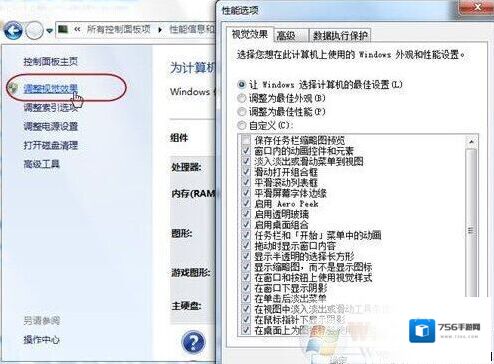 在新窗口中打开“调整视觉效果”项,此时就可以看到视觉效果调整窗口了。 Windows 7默认是显示所有的视觉特效,这里你也可以自定义部分显示效果来提升系统速度。
