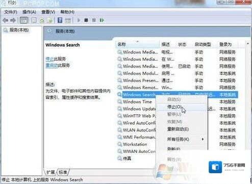 列表中的最后一项最大化和最小化窗口时动态显示窗口的视觉效果去掉完全没有问题,马上动手吧! 5. 关闭系统搜索索引服务 此方法非常适于有良好文件管理习惯的用户,因为自己非常清楚每一个所需要的文件都存放在何处,需要使用时可以很快找到,那么Windows 7的这项服务对你来说就是多余,关掉该服务对于节省系统资源是大有帮助的。 在开始菜单的搜索栏中输入“services”立即打开程序,在本地服务中寻找到“Windows Search”这一项,然后右键点击选择停止此服务就可以啦!