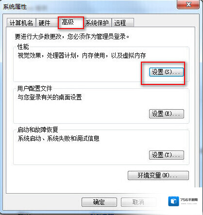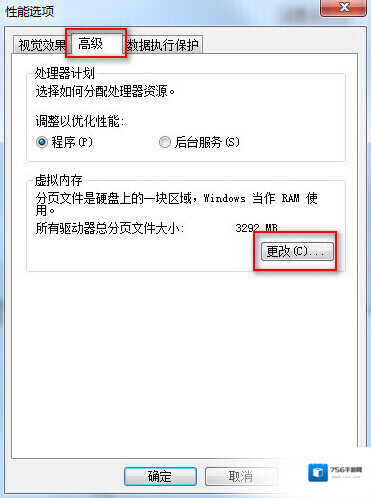 第三步:在跳到“性能选项”的对话框中选择“高级”选项卡,然后点击“更改…”进行虚拟内存的设置。