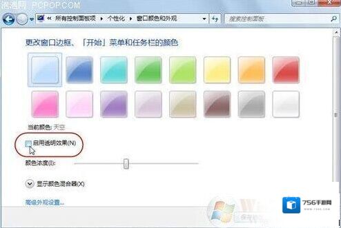 要提醒大家一点,禁用的应用程序最好都是自己所认识的,像杀毒软件或是系统自身的服务就不要乱动为宜。 9. 关闭Windows Aero特效 Windows 7操作系统中的Aero特效就是从Vista时代微软加入的华丽用户界面效果,能够带给用户全新的感观,其透明效果能够让使用者一眼看穿整个桌面。Aero的两项激动人心的新功能 Windows Flip和 Windows Flip 3d,使你能够轻松地在桌面上以视觉鲜明的便利方式管理窗口。除了新的图形和视觉改进,Windows Aero的桌面性能同外观一样流畅和专业,为用户带来简单和高品质的体验。使用发现该特效是花费了不少系统资源才得以实现的。如果你对系统的响应速度要求高过外观的表现,那么不妨关掉它吧! 右键点击桌面打开个性化设置,然后点击“窗口颜色”选项,在弹出窗口中去掉Windows 7默认勾选的“启动透明效果”,就可以关闭Aero特效,不过这样一来Windows 7的界面美观性肯定是会受影响的。