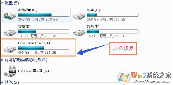 3、修复完成之后“我的电脑”也正常显示磁盘空间,双击正常启动。
