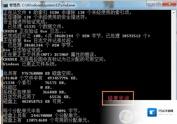 2、输入“chkdsk H:/f”这里修复的H盘,修复D盘就是“chkdsk D:/f”,系统开始修复,过一会儿就修复完成了。