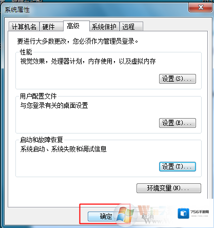 进入系统属性窗口,选择启动和故障恢复中的“设置”按钮