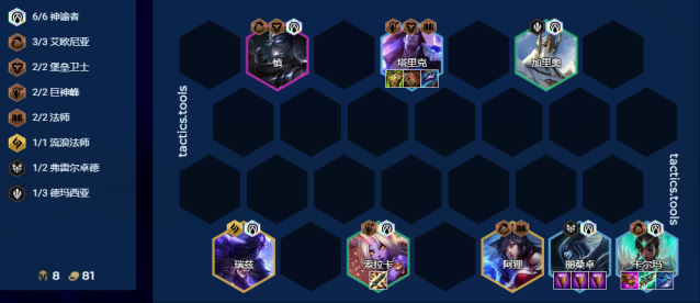 8人口有瑞兹就替换蛇女,上阿狸组成6神谕者3艾欧2壁垒卫士2巨神峰2法师1流浪法师,没有阿狸就也可以选择上亚索