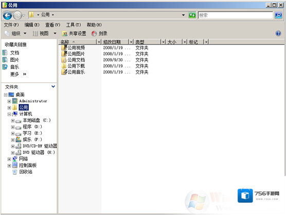 方法5.通过公用文件夹共享文件在Windows Server 2008服务器中可以通过系统默认的“公用文件夹”来实现文件的共享。放入公用文件夹的任何文件或文件夹都将自动与具有访问公用文件夹权限的用户共享。Windows Server 2008服务器系统中只有一个公用文件夹,选择“计算机 | 公用”命令后,即可打开公用文件夹窗口。