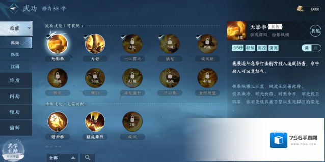 流派技能:铁画银钩+扫六合+不屈守护+蛟龙镇海+丹心饮意