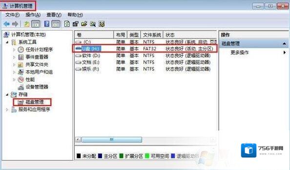 ①右键点击“计算机(我的电脑)”,选择弹出菜单的“管理”,打开“计算机管理”窗口,点击左边窗口中的“磁盘管理”,在右边窗口中就可以找到u盘;如下图所示: