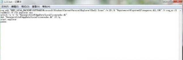 4、最后我们双击运行123.bat文件即可(运行中屏幕会消失闪动一下)。如果想要回复Win7系统快捷方式小箭头可以使用下面的代码,操作方法和上面一样。reg delete “HKEY_LOCAL_MACHINESOFTWAREMicrosoftWindowsCurrentVersionExplorerShell Icons” /v 29 /ftaskkill /f /im explorer.exeattrib -s -r -h “%userprofile%AppDataLocaliconcache.db”del “%userprofile%AppDataLocaliconcache.db” /f /qstart explorer