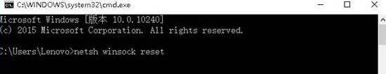 2、在打开的DOS命令窗口内输入netsh winsock reset,敲击Enter回车键。