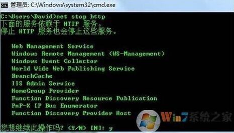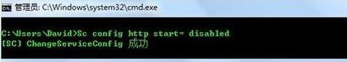 禁用http.sys进程可以通过命令提示符来完成,首先输入net stop http,然后确认继续操作,在输入Sc config http start= disabled即可停止该项服务。如下图: