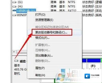 3、右击无法正常显示的U盘盘符,选择“更改驱动器和路径”项。(如果这里找不到你的U盘,跳过这个方法)