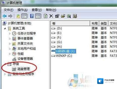 2、在打开的“计算机管理”窗口中,展开“存储”- “磁盘管理”项。
