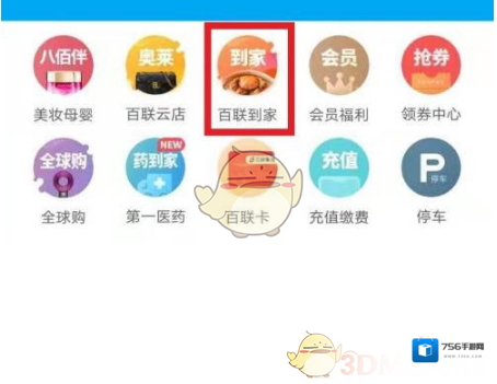 5、绑定后,返回首页,点击百联到家,如图红色文本框: