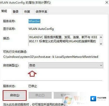 双击打开WLAN服务属性后,将启动类型改为“自动”,然后选择“启动”该服务,启动完成后,点击底部的“确定”保存即可;