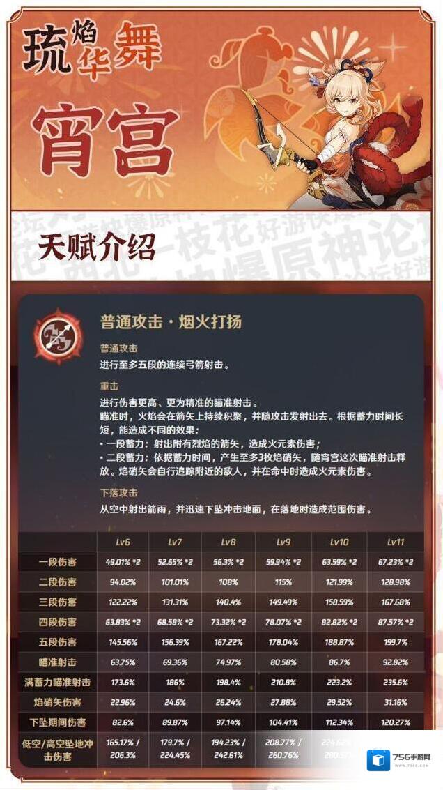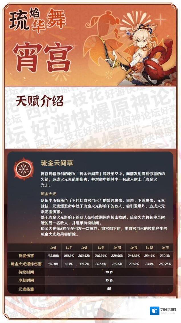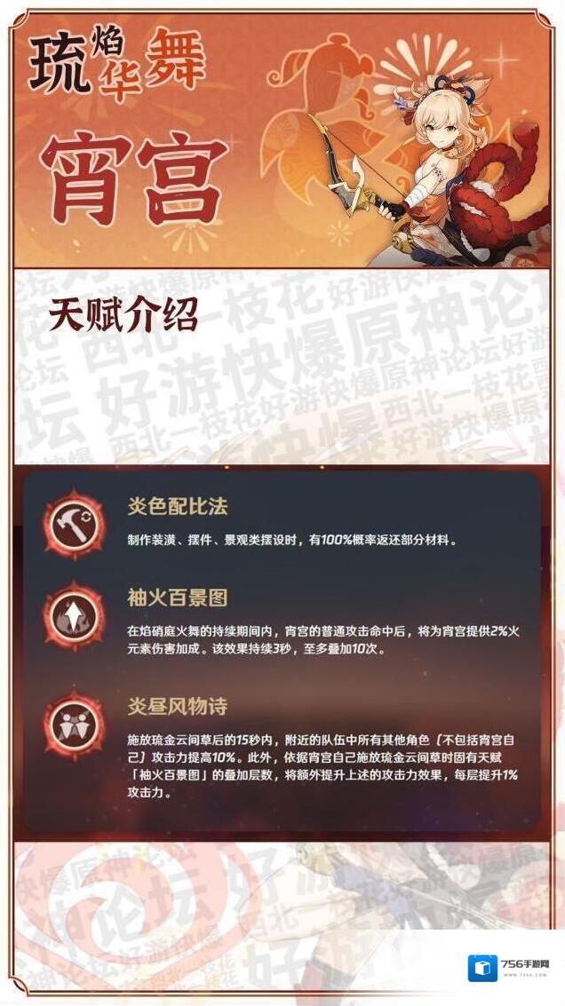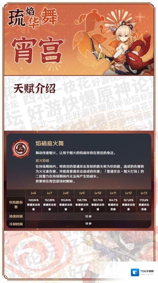 战斗天赋1:在元素战技期间宵宫普通轻击命中敌人获得2%火元素加成至多提升20%。2套平a正好是8秒基于火元素加成区域在18%~20%之间。