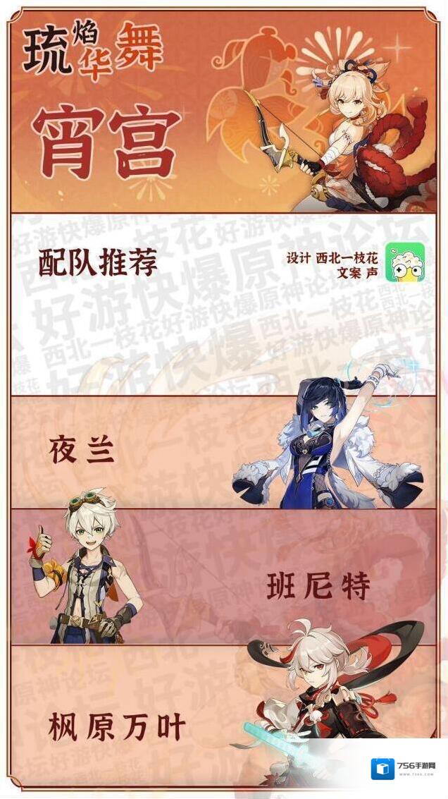增伤输出配队拥有双火的支持加上圣遗物的攻击支持以及班尼特让零命宵宫也不缺少攻击力。万叶则是用来增伤与降低敌人火元素抗性。夜兰大招下可以被宵宫的元素战技触发这让宵宫可以配合夜兰大出蒸发同时获得至多50%增伤。