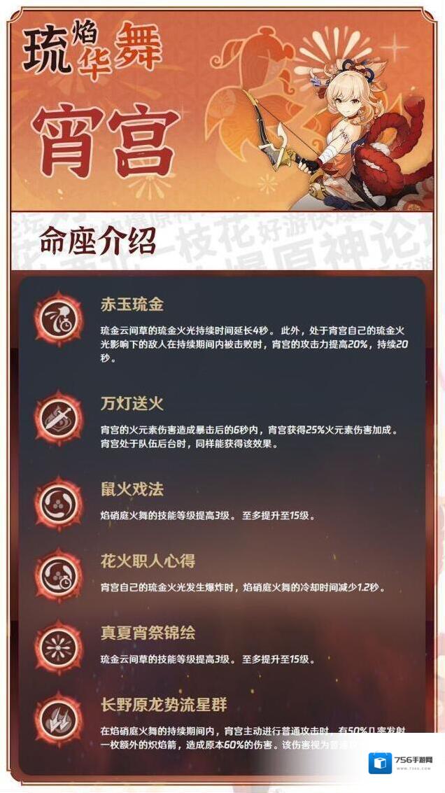 在元素战技期间宵宫有50%几率获得一次『焰硝矢』造成普通攻击的60%的伤害。该命座只是额外获得一次普攻伤害的机会用处并不大只建议抽到5命可以停手了。(因为『焰硝矢』只有普通攻击的60%即使有三次伤害命座达到6命后也跟普攻伤害相差无几)。