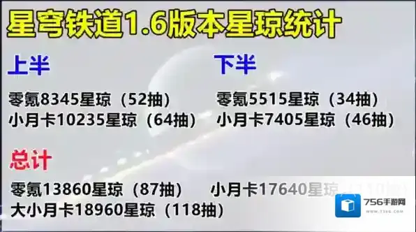 总计上下半加起来,1.6版本零氪至少可获得13860星琼(87抽),小月卡可获得17640星琼(110抽),大小月卡可获得18960星琼(118抽)。