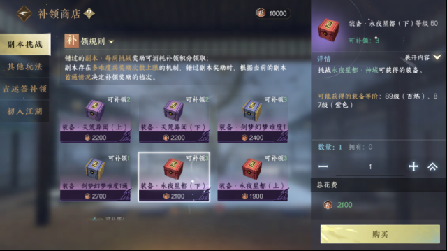 10玩法补领若是懒了完全不想打副本,也不必担心错过奖励。只要通关过对应副本,后续该副本奖励次数溢出后,同门们依然可消耗补领积分换取装备奖励,轻松无忧。