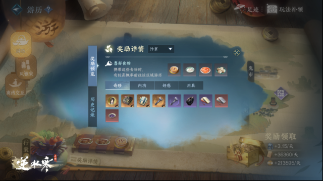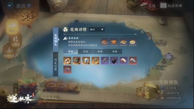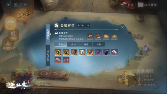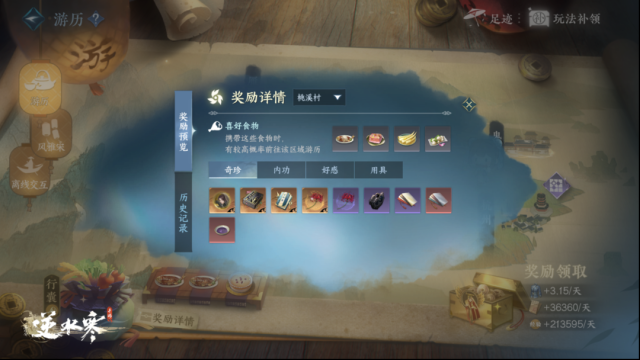 除了独珍装备之外,当前版本击败世界首领还有机会获得91装等的百炼装备,后续还有更高装等百炼装备掉落,让各位同门的毕业之路更加顺畅。8江湖游历江湖游历,惊喜连连。各位同门不仅能收获普通装备与交子,更有机会领取珍贵的百炼装备。游历中,还可能探寻到各种奇珍、内功秘籍、好感度道具以及游历用品。食物选择亦需策略,不同食物引领你至不同地点,掉落的奇珍亦随之变换。各位同门可根据需求,精心挑选食物,踏上这充满未知的江湖之旅。