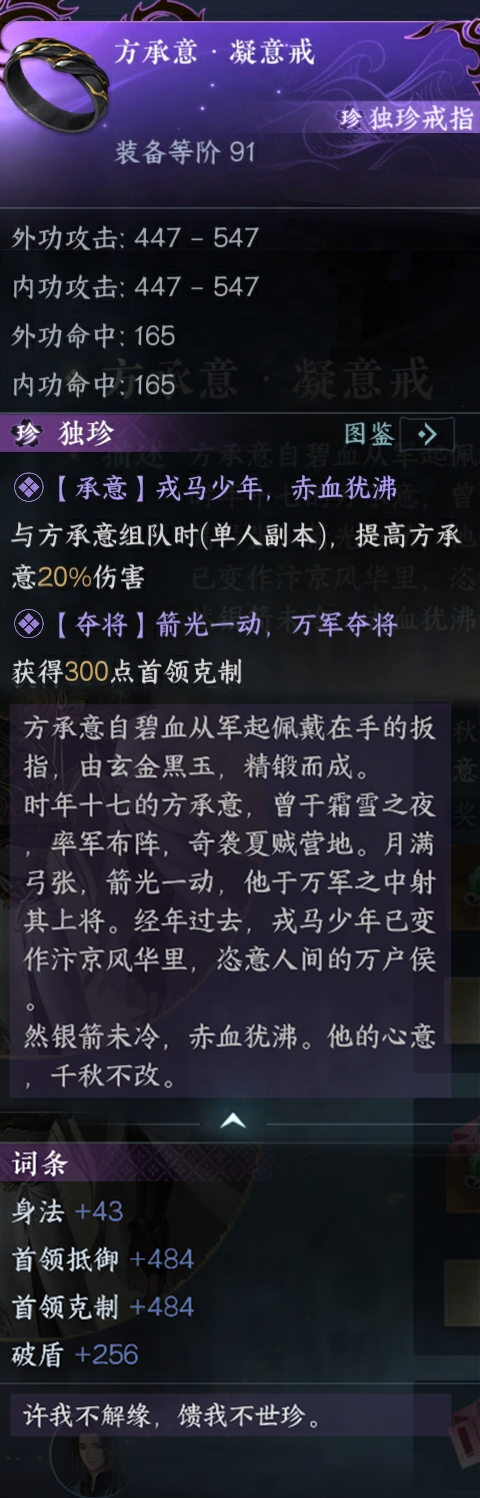 而在方承意的侠游任务之中,与小侯爷一道策马驭箭,听他倾吐彼年那些碧血峥嵘后,也可得到独珍戒指方承意·凝意戒。