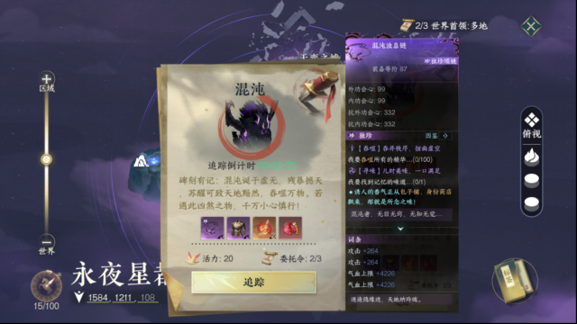 7世界首领在逆水寒江湖中,每日都会刷新强大的世界首领。和同门们并肩作战击败它们,便有机会获得独珍装备。偷偷告诉同门们,参与战斗就有机会开启奖励宝箱,摸鱼也有份哦!其中特别要介绍1.3赛季新增的、来自永夜星都的世界首领混沌,它所掉落的混沌浊息链可吞噬紫装提升战令,且可加工升级,是大多同门所必需的独珍装备。