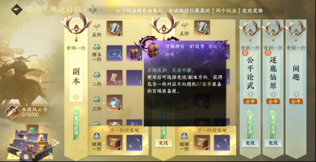 当前,1.3赛季的第一期战令即将圆满落幕,请各位同门抓紧最后的机会,不要错过这难得的装备获取途径。1.3赛季的第二期战令将于5月13日开启,届时各位同门可通过升级战令获取95装等百炼装备,更多精彩内容敬请期待。5段位奖励段位玩法也正体现出逆水寒殊途同归的精髓。五种段位玩法,各位同门可自由选择喜欢的两种玩法提升段位,以获得丰厚奖励。达到琼玉一阶,各位同门便可拿到百炼装备,最多可通过段位玩法获得两件百炼装备。当前段位将于5月12日结束,还未达成的同门请抓紧时间。