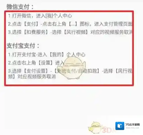 若通过微信支付,则打开微信进入“我”-“服务”-“钱包”-“支付设置”-“自动续费”,找到风行视频关闭服务;若通过支付宝支付,打开支付宝进入“我的”-“设置”-“支付设置”-“免密支付/自动扣款”,找到风行视频关闭服务;若为iOS系统,打开手机“设置”,点击顶部Apple ID进入“订阅”,找到风行视频取消订阅即可。