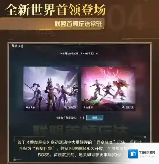 在S4赛季中, “异种降临” 不仅会全面升级为更好玩的“狩猎巨兽”,还会从本赛季开始永久开放!在全新的狩猎玩法中,各位指挥官大人要发挥众志成城的精神,和盟友们一起并肩作战,才能成功挑战。从易到难的挑战难度,除了满满的通关奖励外,相信也会给大家带来满满的成就感!