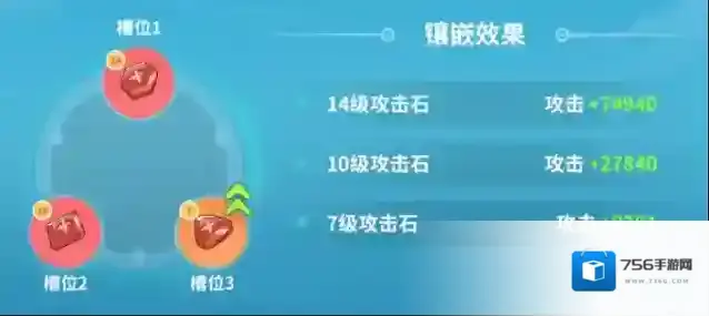 现在我们将9级宝石拆分成3个7级宝石,将组合变成14+10+7,也就是1号孔吃一个7级宝石变成14级,2号孔位吃1个7级变成10级,3号孔位留最后一个7级宝石。