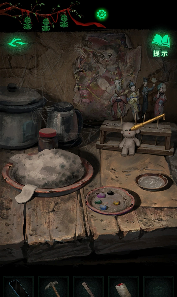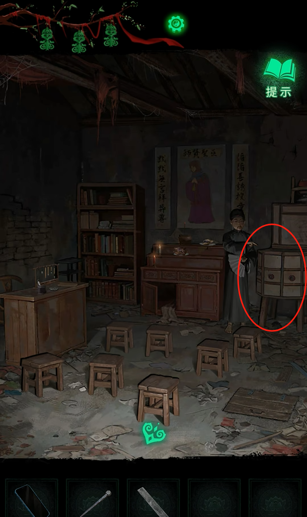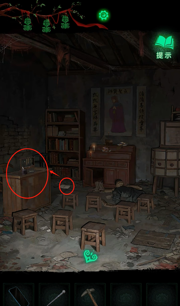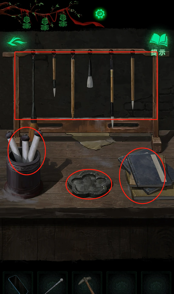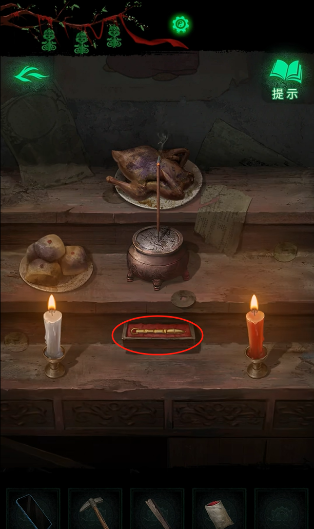 回到说书人房间点击祭品,将祭品摆放如图位置获得金笔