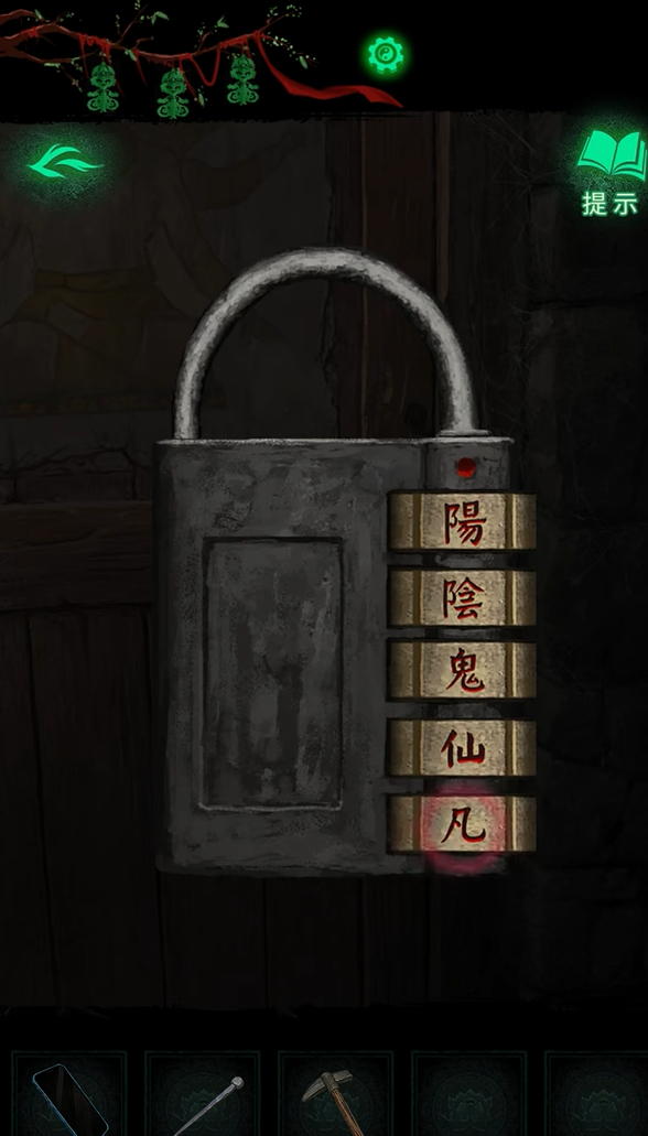 点击门上的锁,将锁上的字眼他调整成阴阳鬼仙凡即可开锁