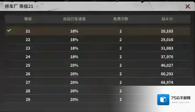 修车厂升级会增加部队行军速度以及修车增加的耐久值,但最大的效果还是增加免费次数。21级以后,免费次数不再增加,所以达到21级之后优先级降低