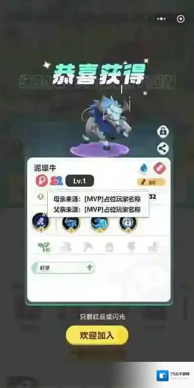 收获界面:成功培育后,在收获弹窗中会显示父母来源图标,点击图标可查看父母双方的培育者名称。
