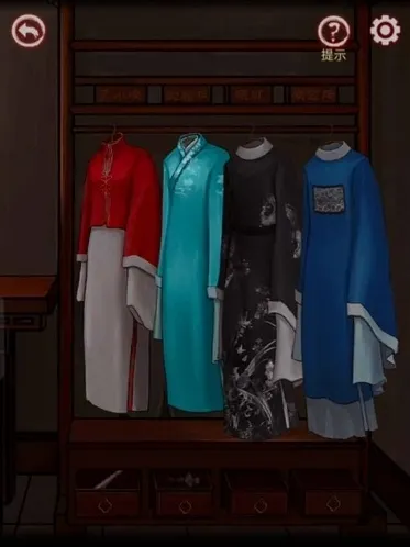 5、点击墙上的机关,得到洞箫和奇怪部件,并放上蜡烛。返回戏台右侧,把戏服挂在架子上,根据每个房间的照片提前调整戏服位置,下方抽屉得到一幅画和稻草娃娃。