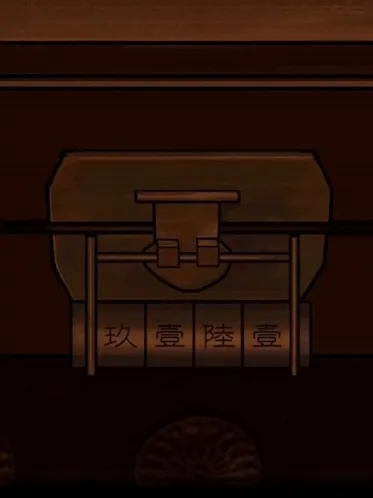 6、回到左后房间,把稻草娃娃挂在柜子上得到密码:9161,回到戏台右侧打开地上的箱子,得到钹和奇怪部件。