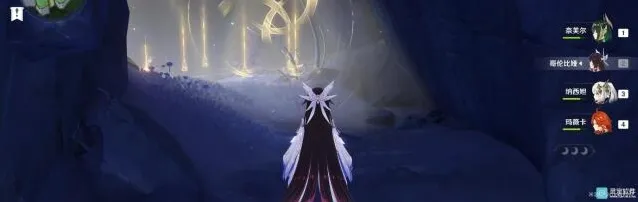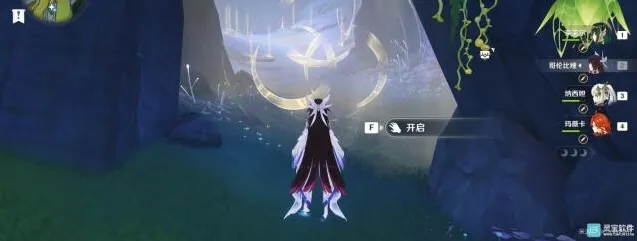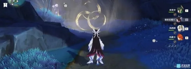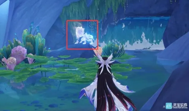 第二处:此处触碰狼的幽影,使其进入月凝壁障,引导獭懒羊移动至此处,并向月凝壁障投掷「种核」使獭懒羊对其释放一次强力的月矩力波使其融解,继续追随并送回