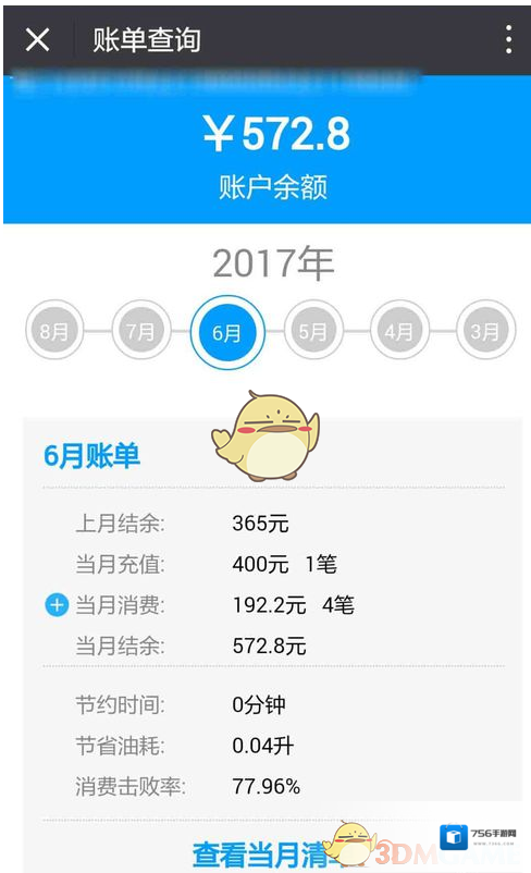 7、进入到账单查询页面后,你可以在上方点击选择要查询的月份,点击后就会显示出当月的账单总的信息。如果想查看消费明细,则还可以点击位于屏幕下方的查看当月清单。