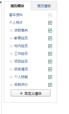 第八步,值得注意的是,简历右边有两个页签,分别是”简历模块”和“简历模板”可以根据自己的情况定制不同的简历