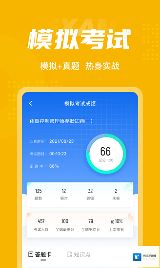 体重控制管理师APP新增模拟考试功能,体重控制管理师可按照自我练习的考点选择相对应的模拟试卷,也可选择搭配好的模拟整卷考试。