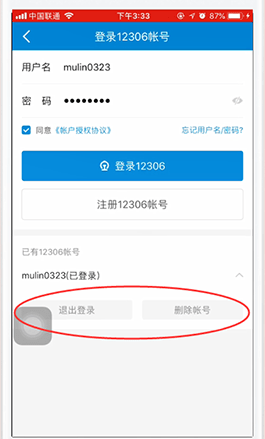 4、在下方已有的12306账号中点击退出登录并且删除账号即可解绑。
