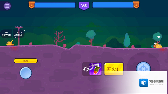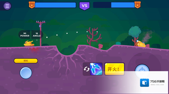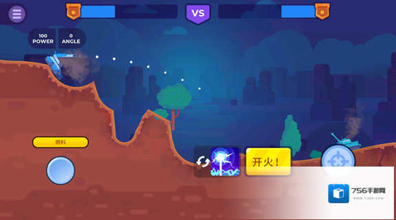 3、进入关卡后点击左边来移动坦克,滑动右侧轮盘来选择发射角度和力度,点击开火按键可以发射炮弹攻击敌方坦克。