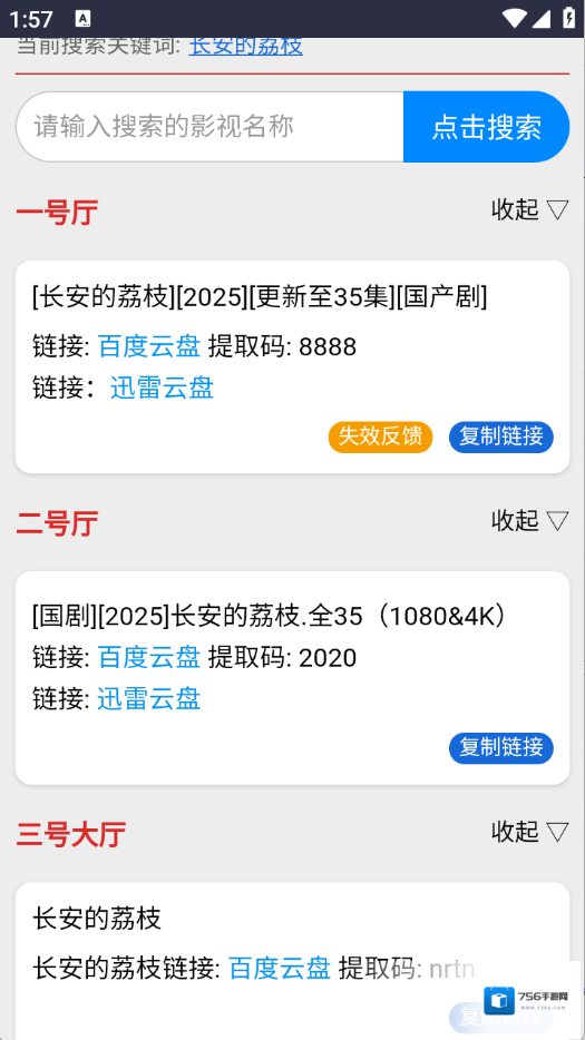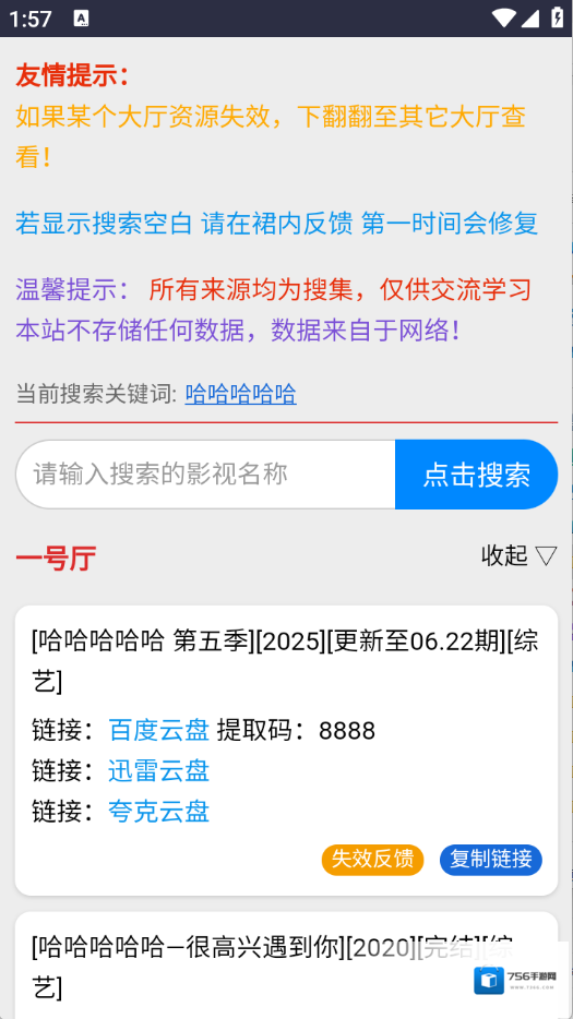 3、用户直接在网站上搜索关键词,即可快速显示各个网盘的影视资源下载链接和提取码,操作方便快捷。</p