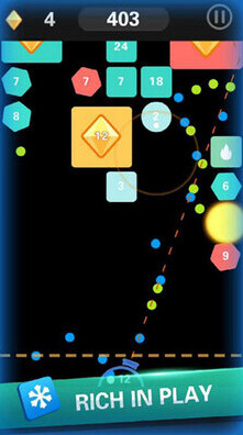 2、游戏中瞄准发射白色小球,沿虚线撞击带数字的砖块与绿色钻石方块,消除砖块并获取钻石、提升分数。