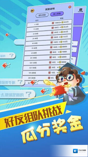2、多样玩法丰富模式:具备个人挑战与多人闯关等多种玩法模式,无论是独自挑战自我还是与好友组队比拼,都能在答题中感受竞技氛围,排行榜实时展示奖励情况,激发答题热情。