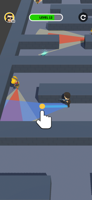 1、指尖拖动移动攻击:通过手指拖动控制角色移动,利用探查半径机制,在进入敌人范围后发起攻击,同时警惕被其他敌人发现。