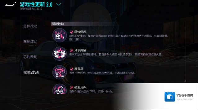 进入更新入口后,在这里汇集了本次游戏性更新的调整思路、车辆优化详情、芯片效果调整、赋能技能介绍、用户界面升级以及排位禁用投票改动等诸多详细介绍,车手们点击左边的分类菜单栏,就可以快速跳转到对应界面,轻松查阅自己想要的关键信息~