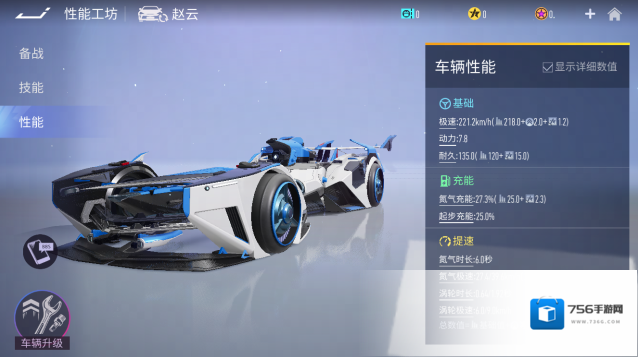 而在“性能界面”,你可以看到车辆当前的基础总数值,包括极速、氮气充能、氮气时长等等。在界面右上角勾选“显示详细数值”,还能清晰地查看到等级、芯片、被动等效果带来的具体数值提升。赛车的一切皆可查,没有人比你更了解王牌赛车!